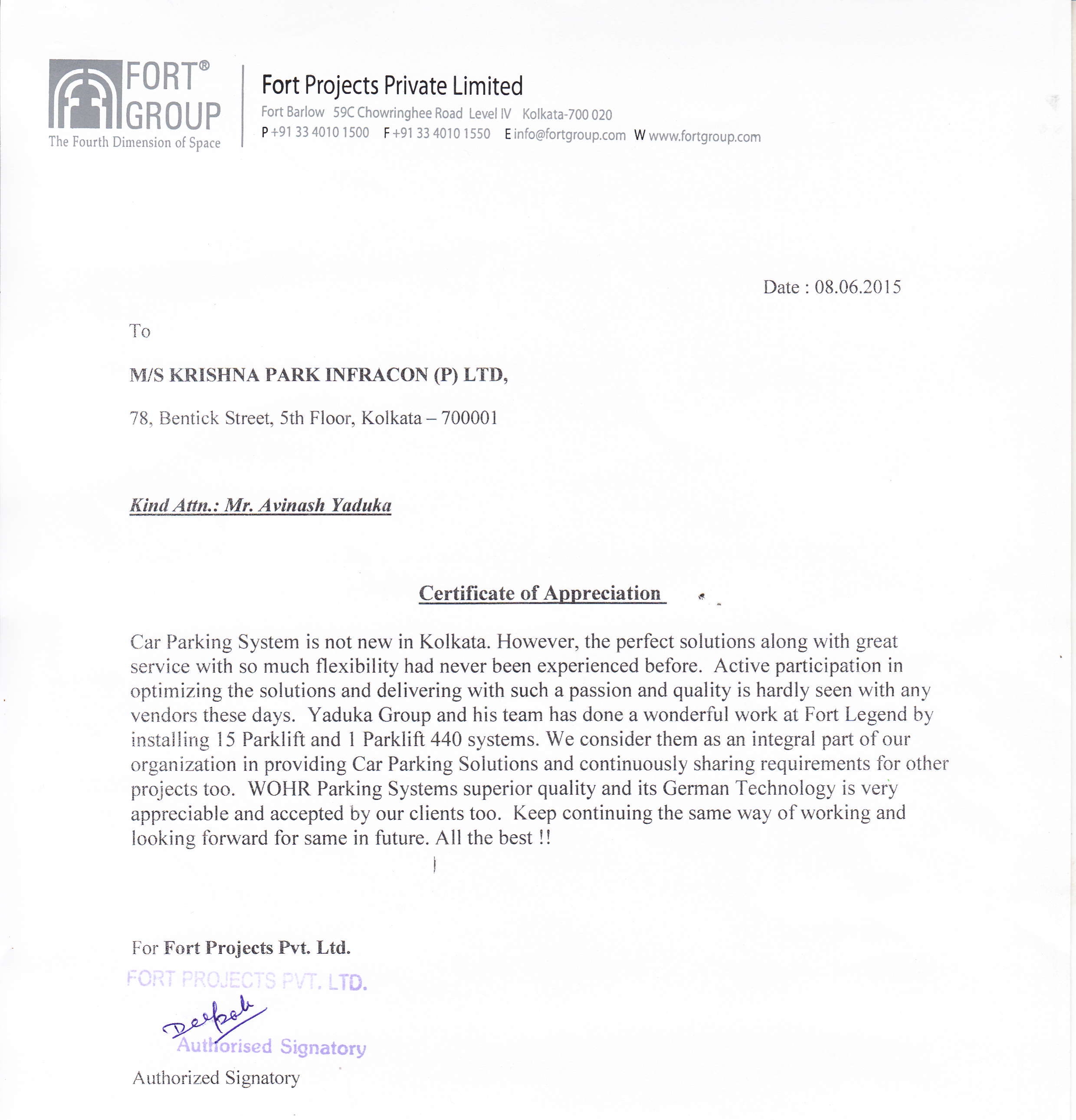 Car Parking System is not new in Kolkata. However, the perfect solutions along with great seruice with so much flexibility had never been experienced before. Active participation in optimizing the solutions and delivering with such a passion and quality is hardly seen with any vendors these days. Yaduka Group and his team has done a wonderful work at Fort Legend by installing 15 Parklift and 1 Parklift 440 systems. We consider them as an integral part of our organization in providing Car Parking Solutions and continuously sharing requirements for other projects too. WOHR Parking Systems superior quality and its Gerrnan Technology is very able and accepted by our clients too. Keep continuing the same way of working looking forward for same in future. All the best !!